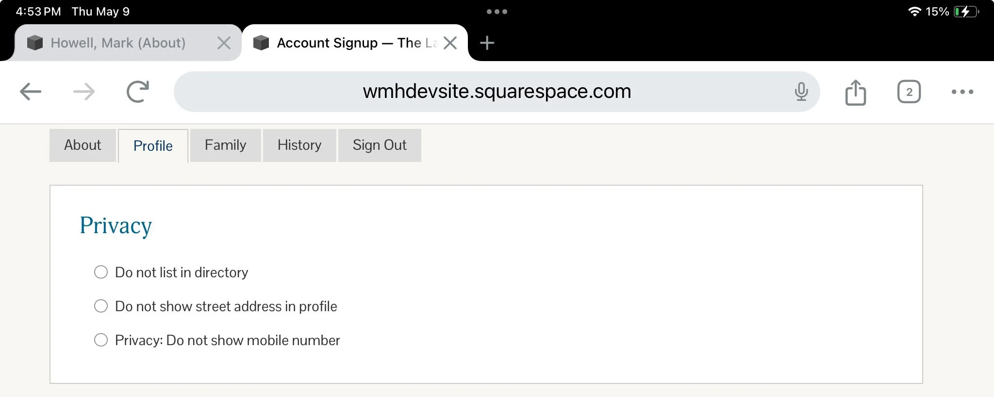 Next comes the Profile form. The good news here is there is very little to fill out. In fact, many will probably skip over this form. But there are 2 sections we need to bring to your attention. First is the Privacy section. Here you can opt out of showing your mobile phone or address in the directory. Or you can choose not to be in the directory at all. If you choose to select certain privacy options you can do so in the following section: